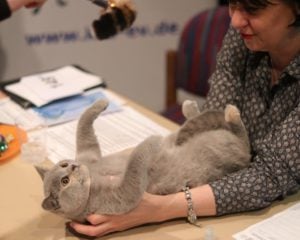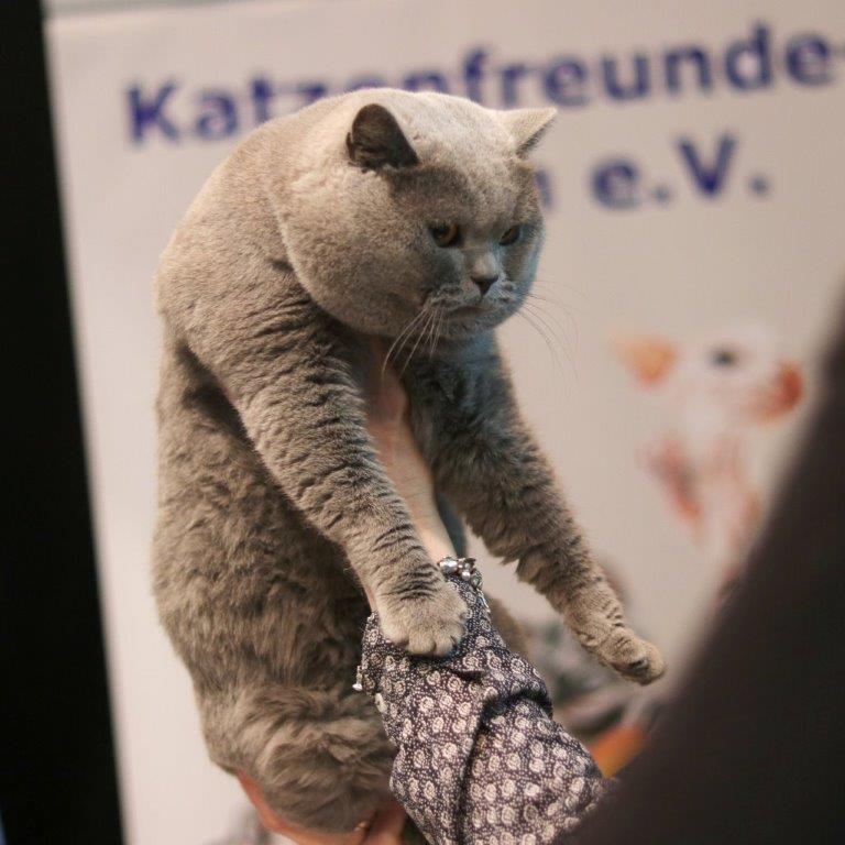 W sobotę wszystkie nasze koty oceniła sędzia ze Szwajcarii Thea Friscovec, przyznając im wszystkim ocenę EX1 a Gregorowi ponadto kolejny certyfikat do tytułu Grand International Champion. W niedzielę nasze koty ocenili dwaj sędziowie: Erik Rejers z Czech (Gregor i Dalmatina) oraz Gina Grob z Lichtensteinu (Easy to Love), wszystkie uzyskały oceny jak w sobotę a Gregor ponadto otrzymał nagrodę BIV (Best in Variety) dla najpiękniejszego niebieskiego brytyjczyka wystawy i został wybrany jako przedstawiciel do popołudniowej prezentacji ras. Jesteśmy zadowoleni z ocen naszych kotów, w szczególności Gregora, który z prawdziwym wdziękiem i spokojem prezentował swoje najlepsze cechy: muskularne krępe ciało, piękną głowę z małymi uszkami i intensywnie pomarańczowymi oczami oraz kapitalne, krótkie futro. Aż miło się na niego patrzy. Oczywiście nasze dziewczyny również wzbudzały duże zainteresowanie: Dalmatina z typową dla siebie słodyczą zaczepiała oglądających (przez co otrzymała nawet kilka podarunków) a biała w czarne łatki Easy to Love stanowiła jak zwykle dużą atrakcję kolorystyczną w swej rasie.