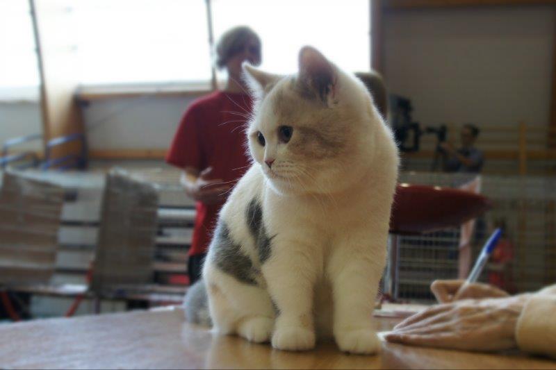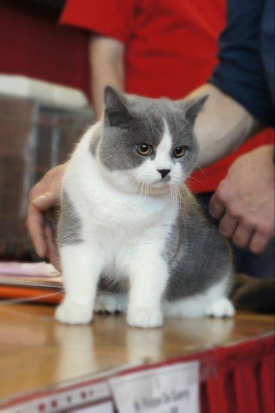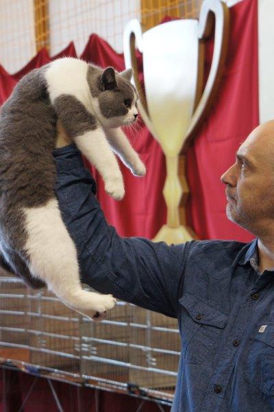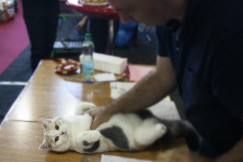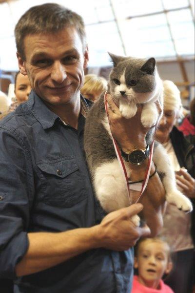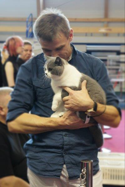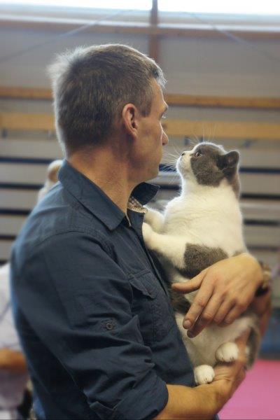 W sobotę Victor oceniany był przez sędziego z Francji, Pana Philippe De Guerny Venturę, którego chyba po prostu zafascynowały nasze koty (na zdjęciu z naszą Rose : ). Sędzia przyznał Victorowi ocenę doskonałą (EX1) i ocenił jako fantastycznego młodego kocurka z wielkim hodowlanym potencjałem, ponadto przyznał mu NOM BIS jako najlepszemu kocięciu, jakie miał okazję w tym dniu oceniać. Victor otrzymał to wyróżnienie pokonując zarówno niebieskie jak i kremowe brytyjczyki. Rose zdobyła identyczny wynik u sędzi z Rosji, Pani Olgi Sizovej tj. EX1 i NOM BIS 🙂 !!!